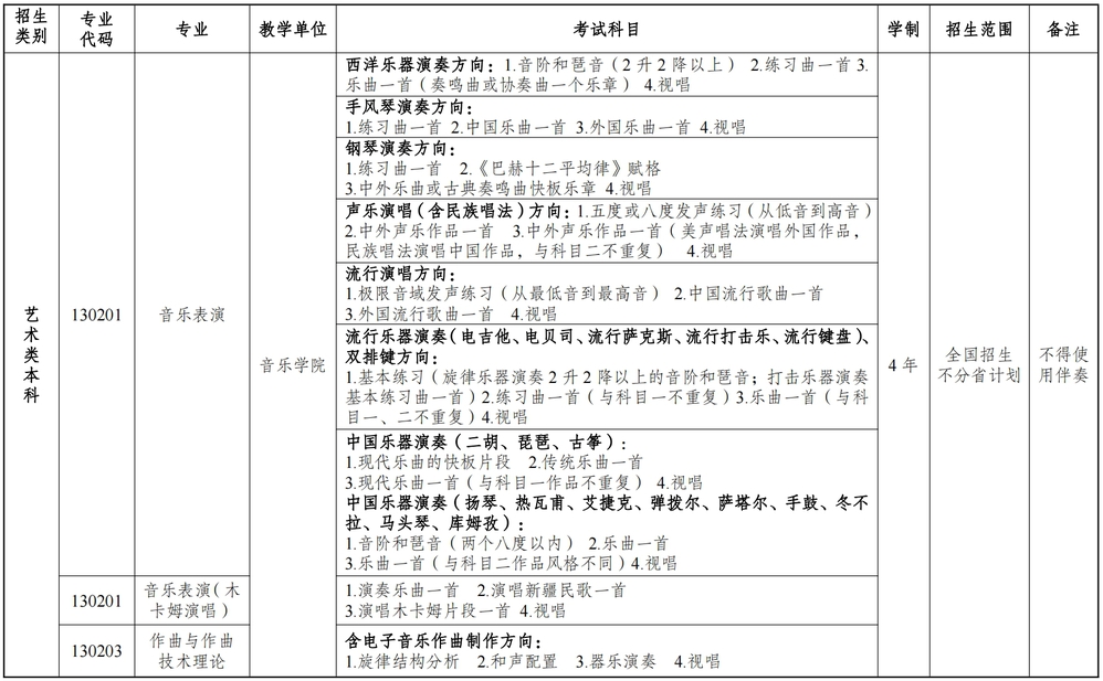 音乐表演、音乐表演(木卡姆演唱)、作曲与作曲技术理论专业组织校考,不做分省计划,文理科(历史类和物理类)兼招,统一排序,不单独设置文理(历史类和物理类)计划数。考生在高考文化课成绩(不含政策加分)达到考生所在省(区、市)普通类专业本科批次录取最低控制分数线、相应科类省级统考本科合格、校考合格的基础上,按照志愿优先的原则,以校考成绩从高到低择优录取。