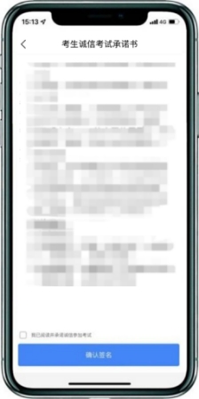 辅机连接成功后,主机会自动提示考生阅读《考生诚信考试承诺书》,考生须逐条仔细阅读后,勾选“我已认真阅读承诺书内容,并承诺诚信参考”,签字确认。