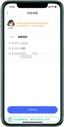 在进入正式考试前,请仔细阅读“提示”信息,继续选择“开始考试”。如辅机网络异常中断,可点击主机本页的绿色区域,辅机扫码连接。