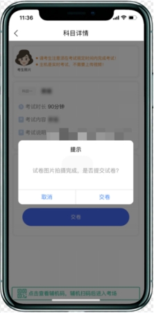 (2)答题纸展示完成后,按要求沿答题纸装订线对折,主机录制结束后立即拍照并上传答题纸照片(上传图片清晰,不得含有姓名、考号、生源地等考生个人相关信息),上传成功后会有弹框提示【答题纸照片拍摄完成,是否进行交卷】,考生确认无误后,点击【交卷】按钮,完成交卷。